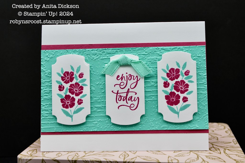Anita used the Exposed Brick Embossing Folder to give the background some texture. I love the simple color scheme with just white, summer splash, and melon mambo. If you want to reproduce this card layout here are the dimensions: