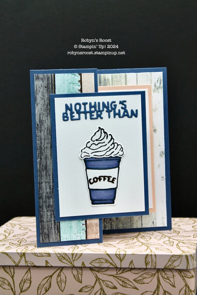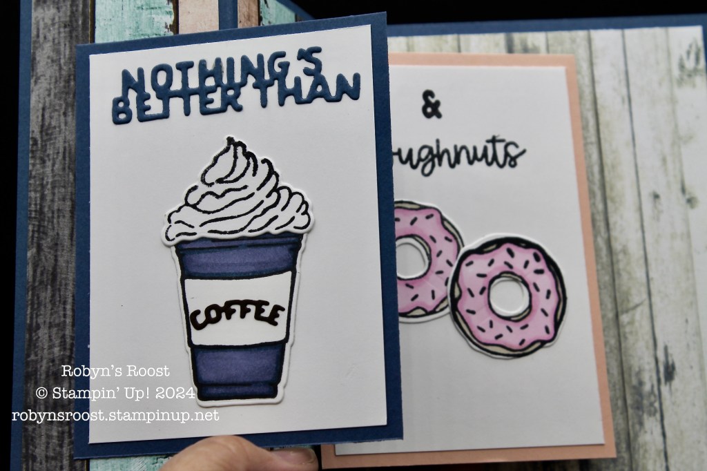 And…with this coffee…some doughnuts! The combination of word stamps and die cut words is fun to work with. The images have been colored with Stampin’ Blend Markers. This fun Z Fold card features a tower which a platform for a second flat to decorate.