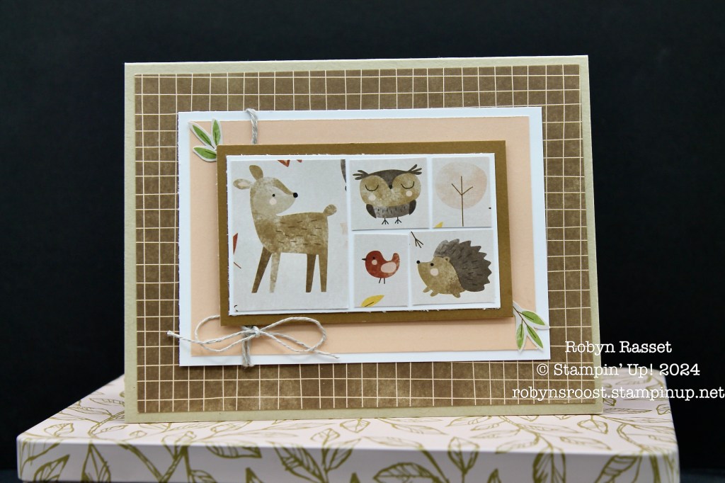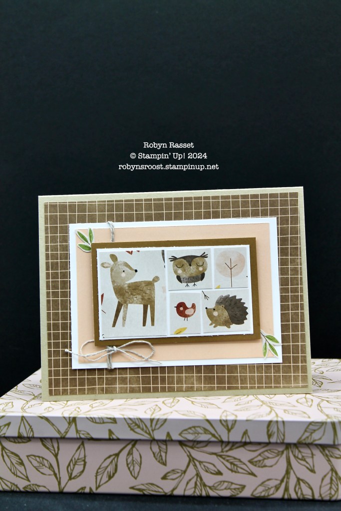 It was actually one of the hardest to make cards I’ve ever done, lol. The little animals are all cut out of the designer paper and trimmed to fit. I only had the one piece of paper that Dawn sent in the kit so I couldn’t screw up! I don’t think I’ve ever trimmed so many tiny, tiny pieces off, trying to not take too much. I love the brown grid pattern on the layer in the background! That is another design from the pack.