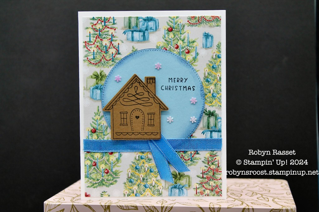 The Humble Home is stamped on Pecan Pie paper with Tuxedo Black ink and with one squeeze of the punch it’s cut out. The Balmy Blue circle is die cut with the largest circle die in the Stylish Shapes Dies. The edges have been flicked with a sponge dauber dipped in Blueberry Bushel ink. I didn’t have any of the new White Loose Snowflakes, which I wanted to use, but I did find some retired snowflakes that were really similar. The Azure Afternoon ribbon is also retired. I wanted a darker blue than the Pool Party Pompom Ribbon but looking at the Mini Catalog on page 32, they show coloring the ribbon with a Stampin’ Write Marker, darn, I need to try that!