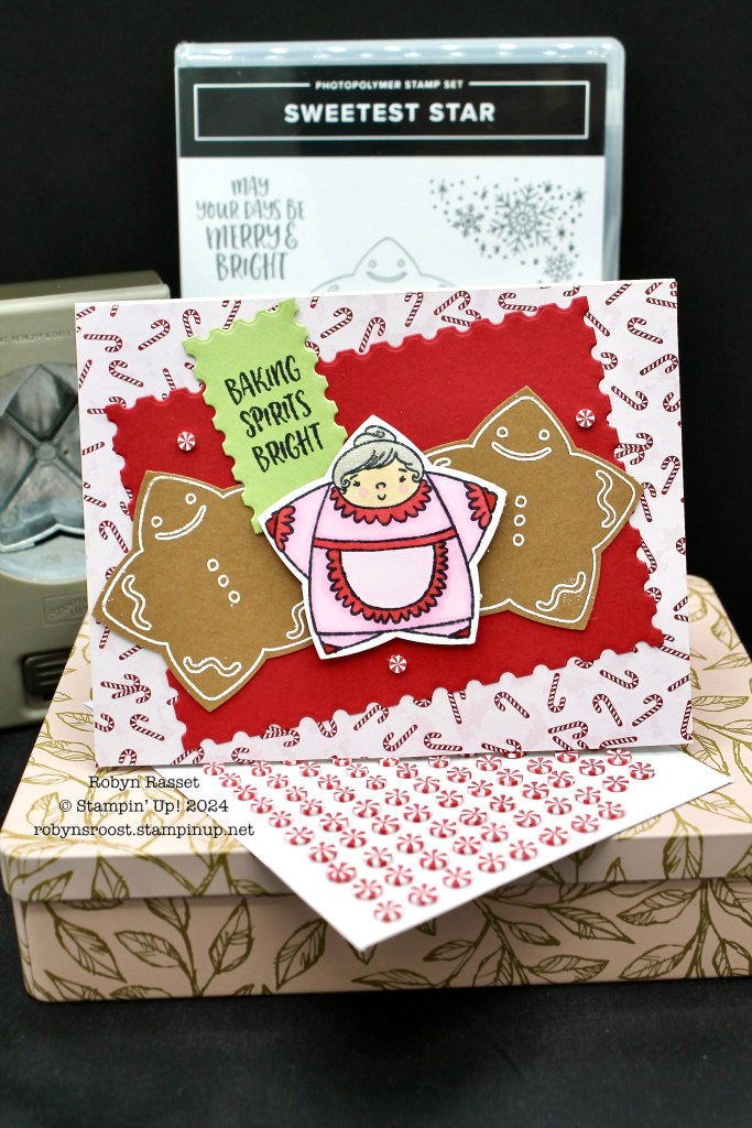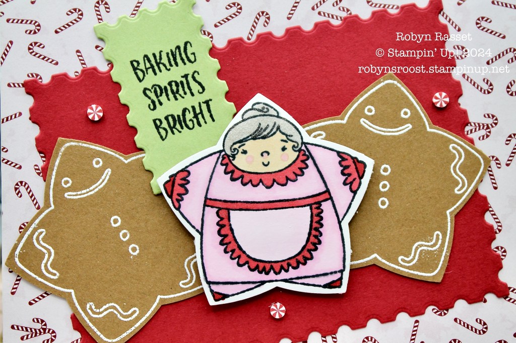 I love how the gingerbread cookies look when heat embossed with white embossing powder on Pecan Pie cardstock! Mrs. Claus also has Wink of Stella brushed on her for some Christmas glitter but it doesn’t show in the photo. The Perennial Postage Dies were used to cut out the greeting label and Real Red background.