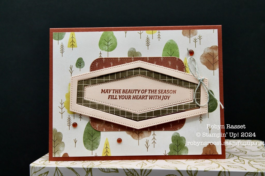 Dawn’s original design used the Autumn Expressions stamp set which coordinates with the Autumn to Remember scrapbooking kit. I didn’t have that stamp set, so used a greeting from the Autumn to Remember stamp set. This card uses the Nested Essentials Dies.