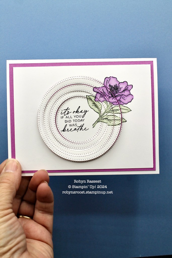 The Stylish Shapes circle dies were used to created the layered circles. To begin, the image and greeting were stamped on a 3 3/4″ x 5″ piece of basic white cardstock. Next, the flower was colored with Petunia Pop and Soft Sea Foam Stampin’ Blend Markers. Then, the four circle dies were layered onto the paper, centering on the greeting, and then run through the Stamp, Cut & Emboss Machine.