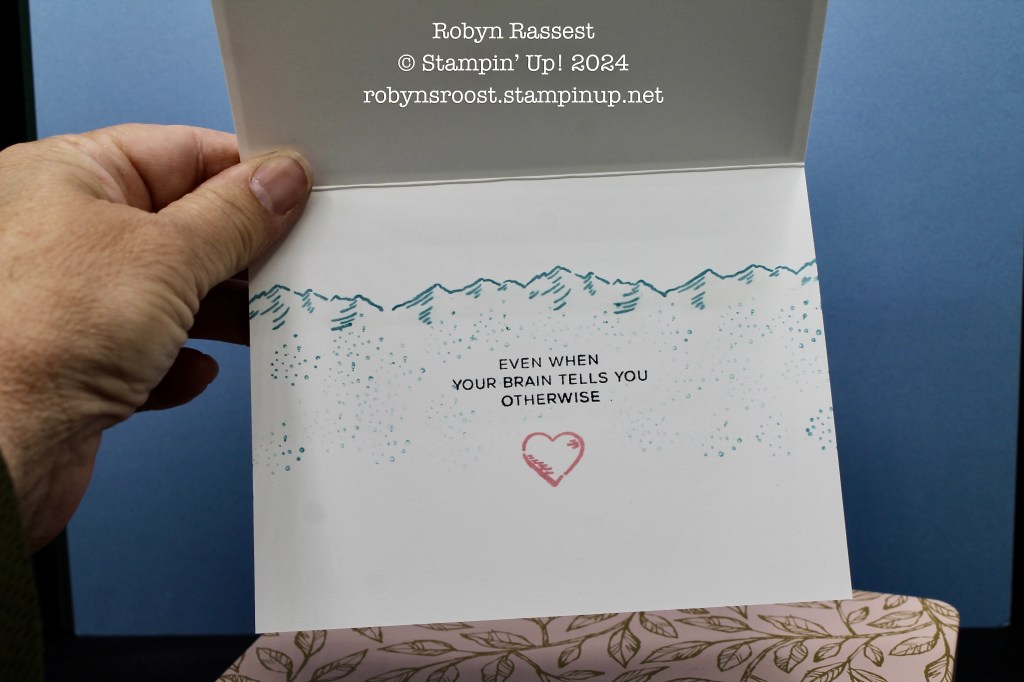 The inside uses the mountain image, heart and speckles from the Love & Strength stamp.