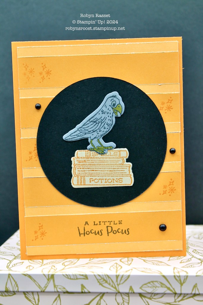 The base is our regular Pumpkin Pie cardstock that is cut to 8 1/2″ x 5 1/2″ and scored at 4 1/4″. Some sparkles were stamped with Pumpkin Pie ink on the darker strips. The 3 1/4″ Basic Black Circle is cut with a die from the Christmas Friends Die set. The Raven and books are from the Potions & Spells stamp set and dies. The Raven is stamped on Basic Gray with Tuxedo Black ink and the beak and feet are colored with a Daffodil Delight Stampin’ Write Marker. Three black gems were added to complete the front of the card. I used the Matte Black Dot on this card, which are no longer available but I have included a link for Sparkle Gems which would work as well.