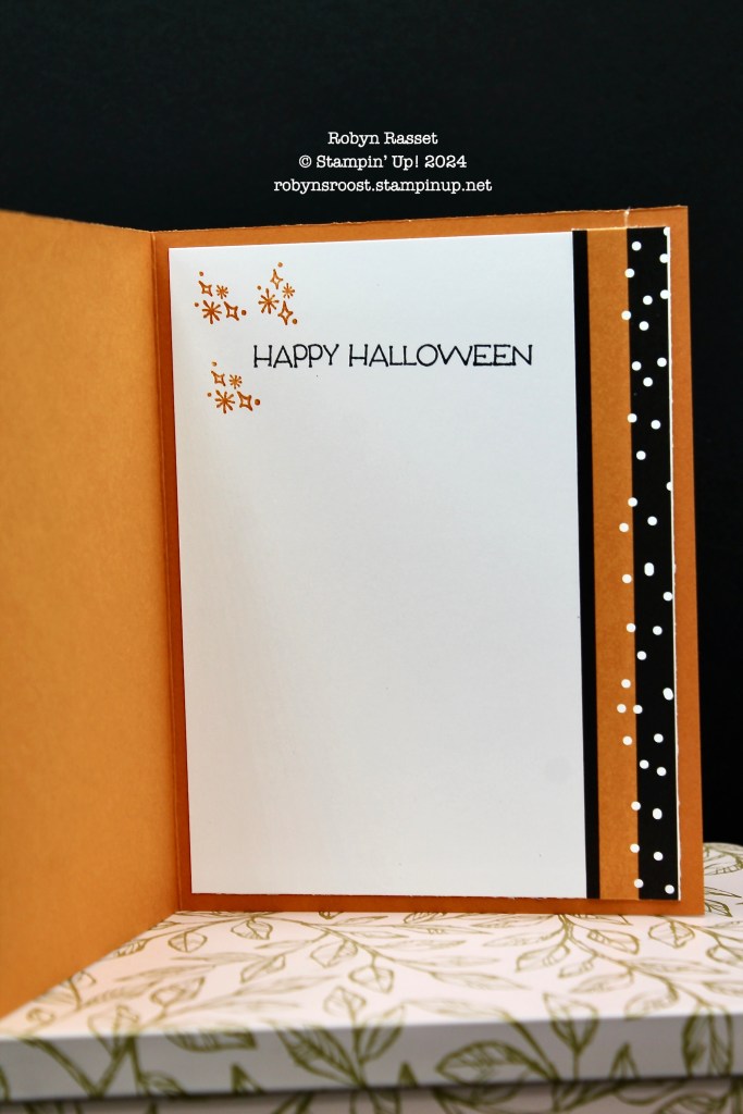 The inside of the card has a strip of the Halloween Spells DSP, part of the Memory Keeping Line of products. It’s mounted on a 4″ x 5 1/4″ piece of Basic White which is stamped with a greeting and sparkles from the Potions & Spells stamp set.