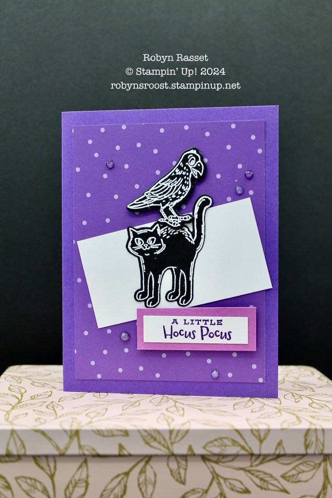 I stamped the cat and raven with VeraMark ink on Basic Black cardstock and heat embossed them with White Embossing Powder before die cutting them. The dotted paper is from the Halloween Spells DSP which can be found online in the Scrapbooking Brochure.