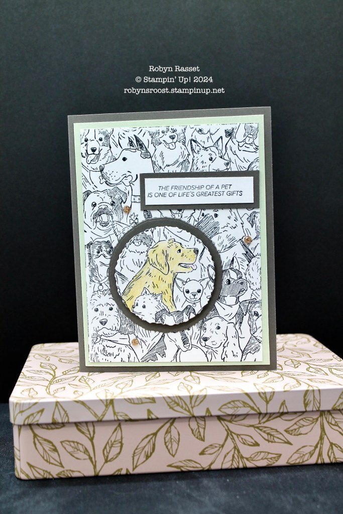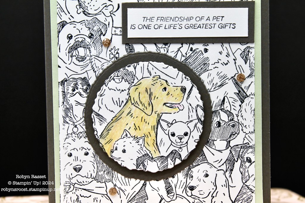 The Doggone Friendly stamp is one large background stamp with lots of different dog breeds represented. For this card, I’ve chosen to color the Golden Retriever with Watercolor Pencils. Watch my Pet Sympathy Video Tutorial to see this card created. I actually used two different pencil colors, Daffodil Delight and Cajun Craze and blended them with a Blender Pen.