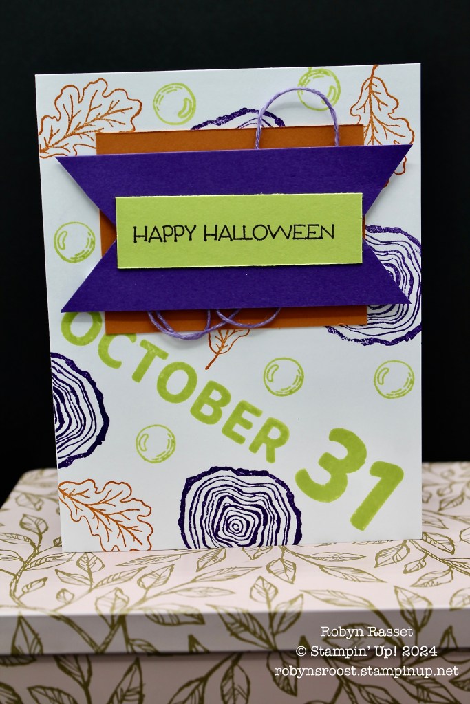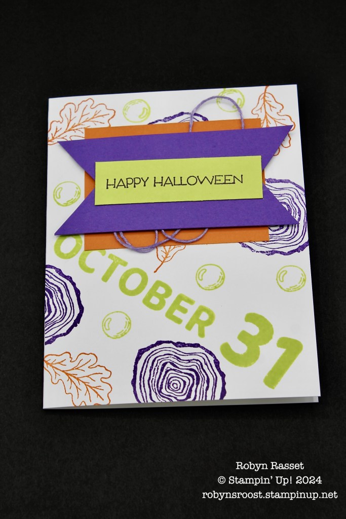 This layout is taken from page 22 of the annual catalog, It the second to last layout on the first row. I’ve actually pulled stamps from three different sets to create this card. The date is from the Halloween Memories stamp set which is found in the online Scrapbooking Brochure, the log and leaf are from the Autumn Expressions stamp set, and the bubbles and greeting are from the Potions & Spells set.