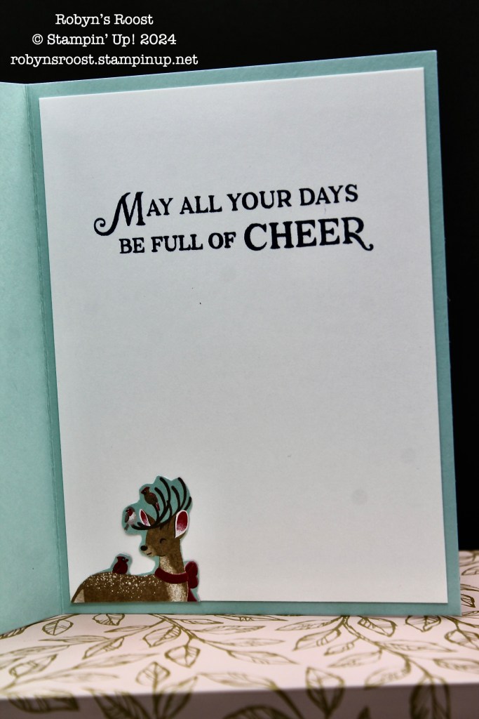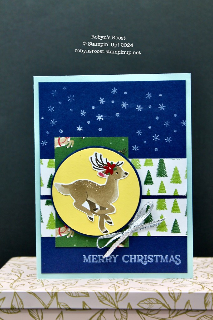 This cute deer comes from the Reindeer Days Designer Series Paper as do the two patterned designs behind the deer. Do you like the look of white ink on the Night of Navy paper? I think it gives the card a real night time feel.