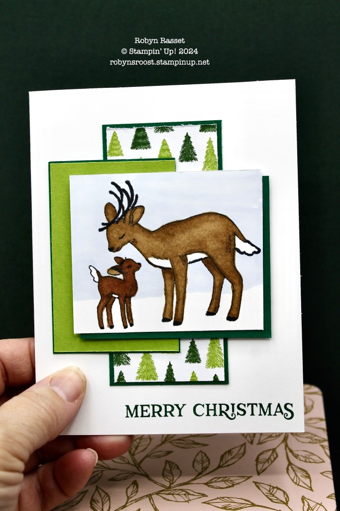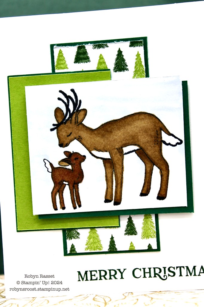 I did put layers under each of the panels because they seemed to become lost on the white background. The matts are all Shaded Spruce. The large deer is colored with Pecan Pie Stampin’ Blend while the baby was first given a coat of Light Copper before coloring him with the Pecan Pie. I thought about adding some of the Red & White Peppermint gems but I really like the green and white colors and was afraid that the red would be out of place.