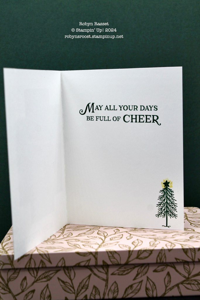 For the inside I stamped the greeting and cute little tree in Shaded Spruce. Then I thought that the star looked too dull without being inked in yellow so I just added a few strokes of Daffodil Delight with a Stampin’ Write Marker.