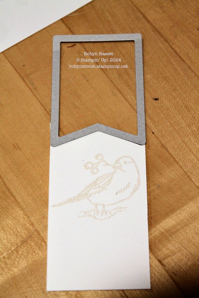 - Next a 2 1/4″ x 4 1/4″ piece of Watercolor paper has the bird image stamped with VersaMark ink, covered with White Embossing Powder and heat set. The largest flag die from the Stylish Shapes Dies was used to cut the tag top as shown below.