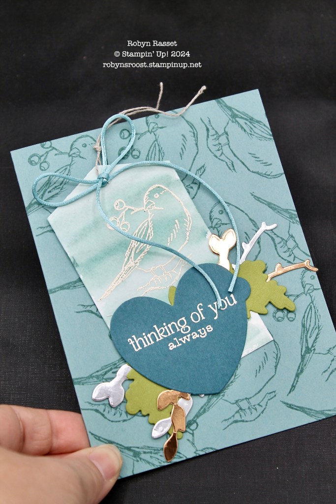 - It starts with an 8 1/2″ x 5 1/2″ piece of Lost Lagoon scored at 4 1/4″. This is stamped with the single bird image from the Winterly Tree Tops stamp set.
