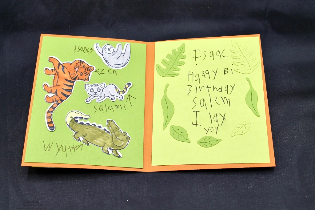 He got all of the animals from the stamp set on the card, lol. He even indicated which cousin they each stood for.