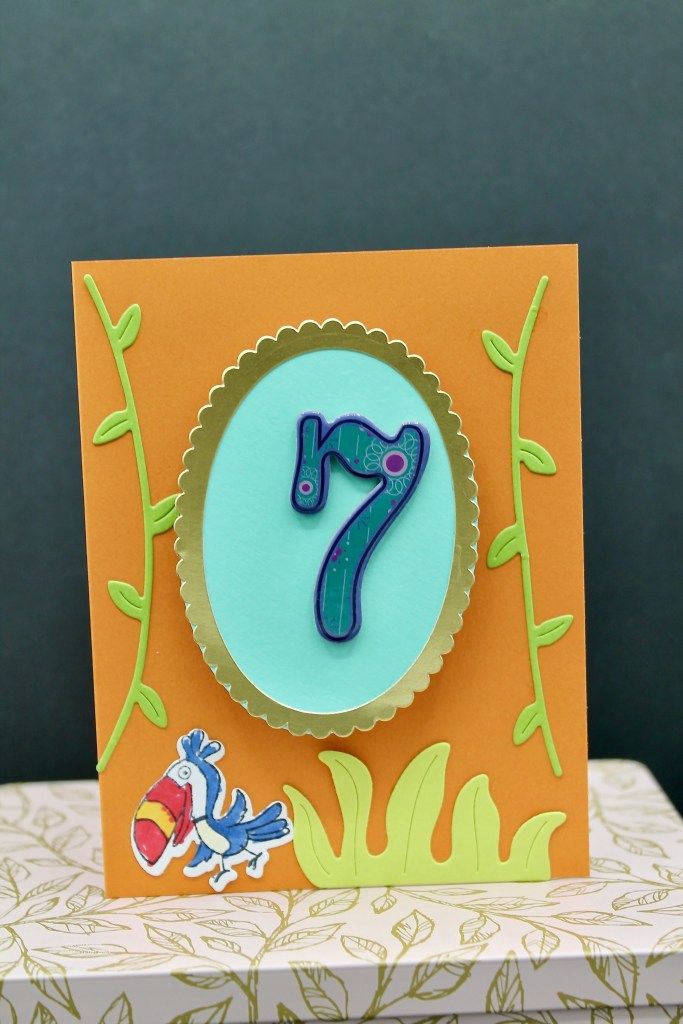 He wanted the birthday number to pop up, so we put a springy thing on the back of the number. It was too big to put directly on the number so we placed the number on a layer and found an unused gold foil die cut that framed the number. The retired Jungle Pals stamp set and dies were a great match for the party theme which was jungle animals.