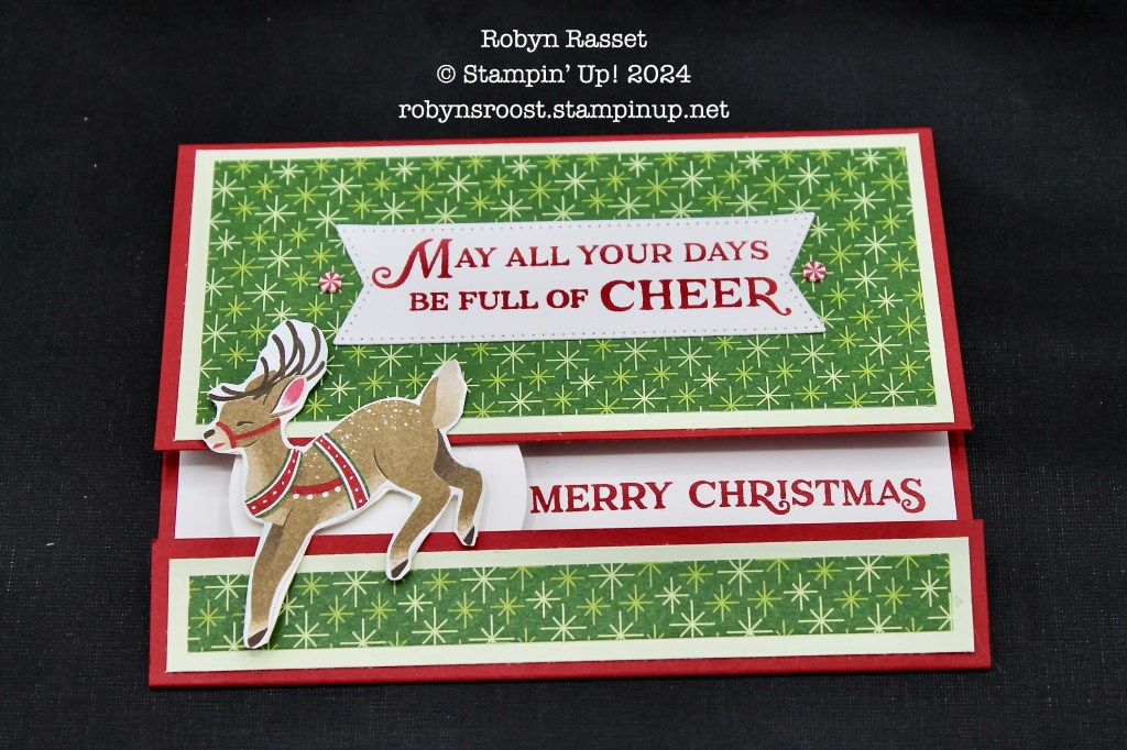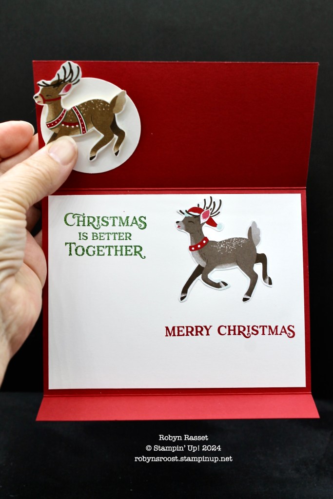 This card uses a reindeer from the Reindeer Days Designer Series Paper. The designer paper wasn’t thick enough so I cut a second deer from the thick basic white paper and glued the two together before adhering to the circle.