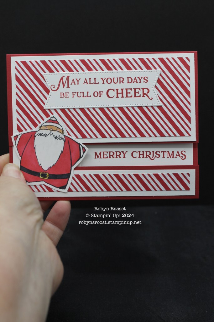 I used a 2″ circle punch to create a backer for the slider and the Santa was adhered to the circle with two stampin’ dimensionals. The Santa is created with the Sweetest Star stamp set and punch bundle.