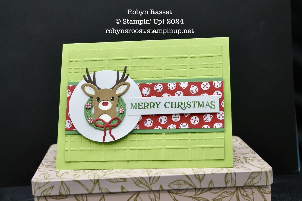 The reindeer is so easy to make! There are three different dies to cut and then layer. The red nose in an extra little piece, in addition to the deer dies. I actually used the little heart from the House Punch. The background is embossed with the Plaid Embossing Folder, Part of the Reindeer Days Suite.