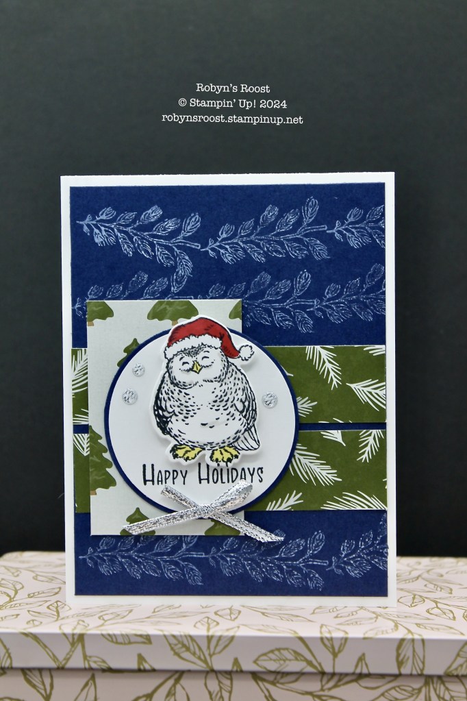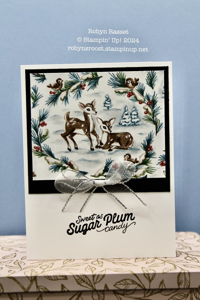 This greeting is from the Christmas Labels stamp set, which has an awesome set of coordinating dies, these are also on the retiring list. The Sentimental Christmas Designer Paper used here is retiring as well, plus, for each pack of this DSP purchased $3 is donated by Stampin’ Up! to a charity supporting children’s literacy. How awesome is that?