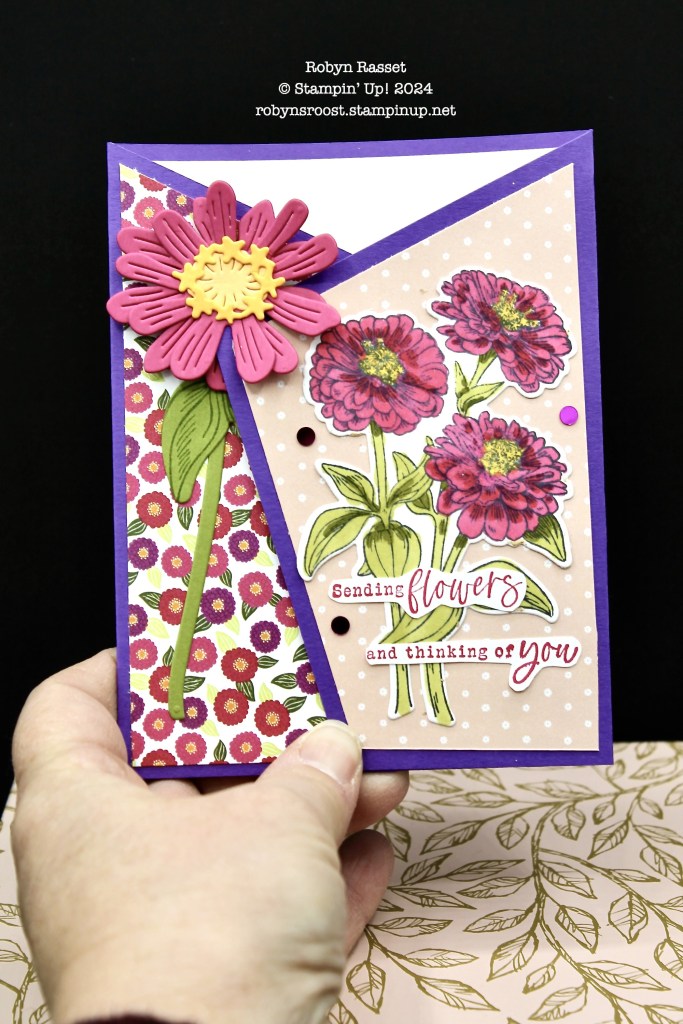 Today’s card is a fun fold that makes me think of a fancy jacket collar. I’ve combined it with the Simply Zinnia Bundle which is retiring and is only available while supplies last.