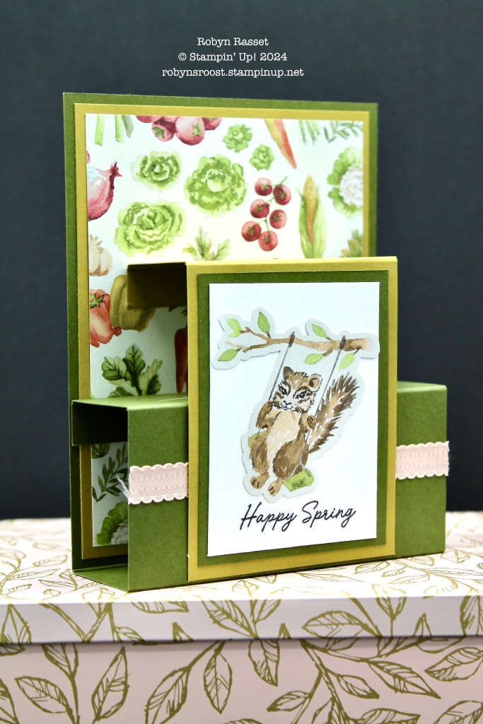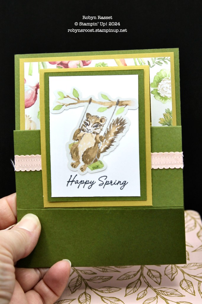 The only stamping on this card is the greeting. The Storybook Moments Designer Series Paper has 2 sheets with die cut images like this little swinging squirrel, plus 10 sheets (5 more designs) with fun animals and garden items.
