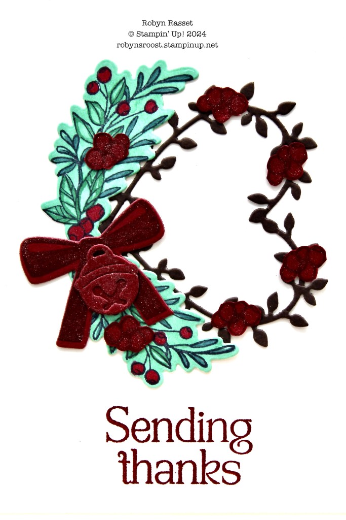 The heart shaped wreath is part of a bundle that will be available for Free with a $120 purchase during Sale-a-bration, Jan 7 – February 28. The swag is from the Winterly Tree Tops Bundle and is colored with Stampin’ Blend Markers. It started out on basic white paper but the card matte and base are vanilla so I ended up coloring in the entire background as well as the image. Everything done in Cherry Cobble was given a coat of Wink of Stella for some shimmer. The bow is from a really old die set called Wonderful Wreath Framelits Dies. The jingle bell is from the Reindeer Fun Dies and the berry bunches are actually from the Nests of Winter Paper Pumpkin set and were fussy cut.
