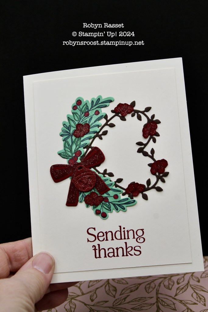 I’ve got my Christmas cards all done, so I decided to create a thank you card with the inspiration. I was really intrigued with this challenge. So much so that I spent most of a morning creating two cards when I SHOULD have been wrapping Christmas presents, lol.