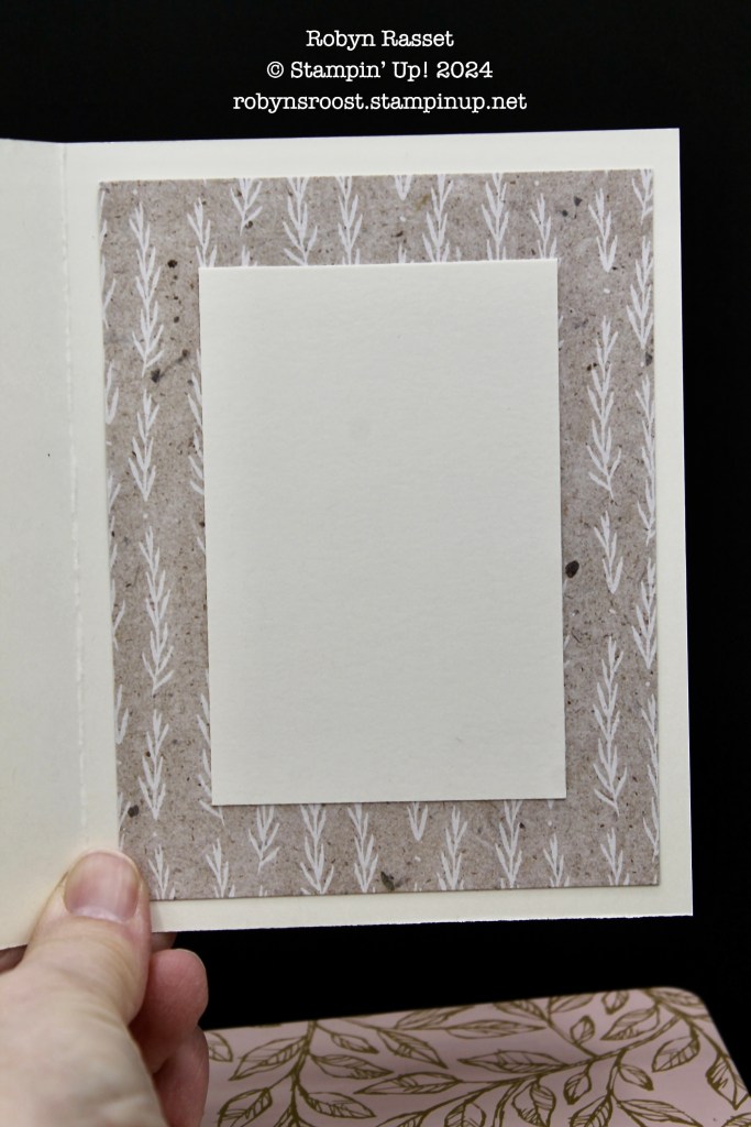 The inside of the card was finished off with a 3 3/4″ x 5″ piece of the Perennial Lavender Designer Paper with a 2 1/2″ x 3 3/4″ piece of Very Vanilla to write on.