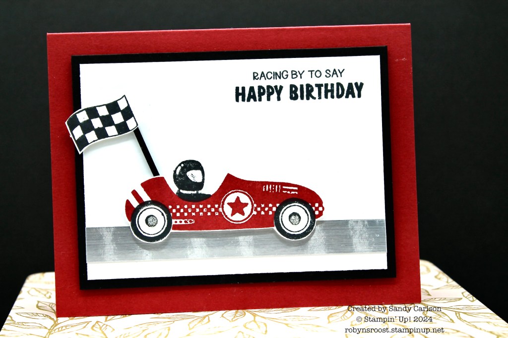 This cute card uses the Racing By Stamp set and vibrant red, black and white colors. The silver foil roadway and sparkling rhinestone hub caps add a nice hint of bling. This card is sure to make any car buff smile.