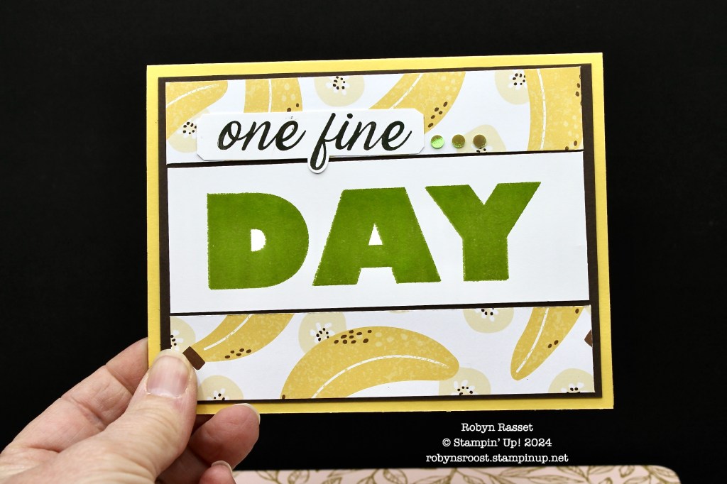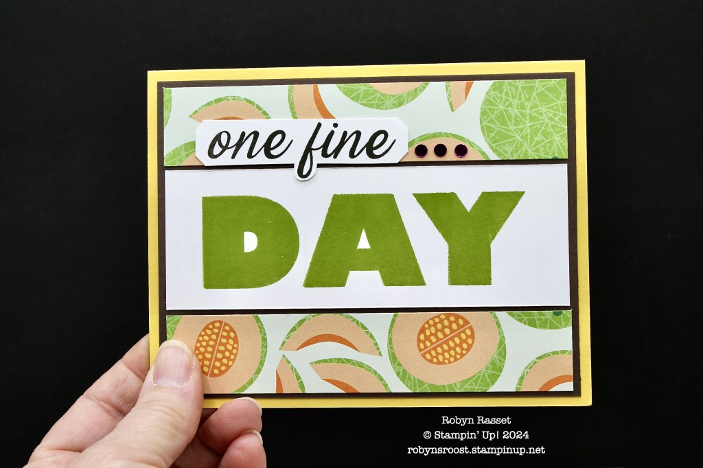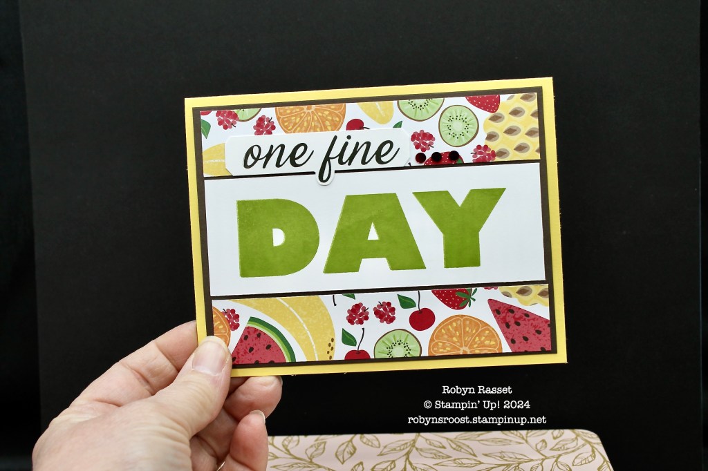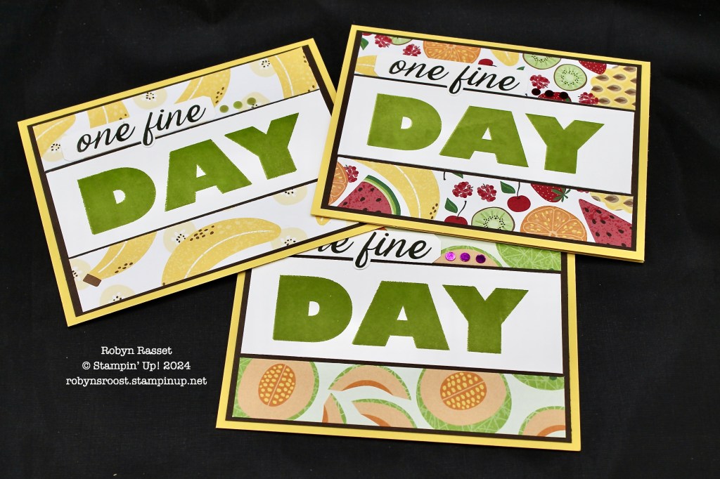 These cards were created using 2 of the Free Sale-a-bration (SAB) products. The Documenting the Day stamp set, which is great for scrapbooking with the large text, and the fun Fruit Salad Designer Paper.