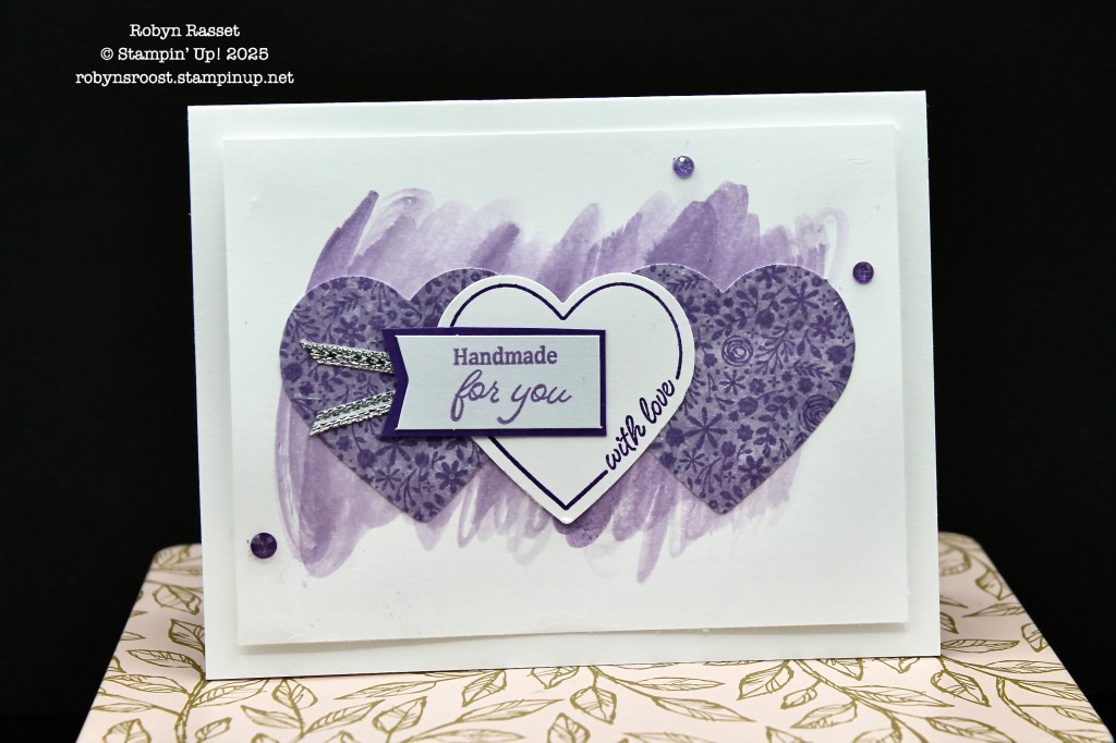 The final card uses more supplies from the I’ll Bee Yours Paper Pumpkin. It’s done in Highland Heather and Gorgeous Grape colors. I absolutely love the heart stamp with the words as part of the outline! The two purple hearts have been stamped with the large background stamp from the kit with Gorgeous Grape ink. Some of the hearts in the kit were preprinted with white flowers and we used those in class too. I’ve added a little piece of silver ribbon and some Purple Shimmer Gems. A watercolor wash of Highland Heather ink was added with a Watercolor Painter to the background.