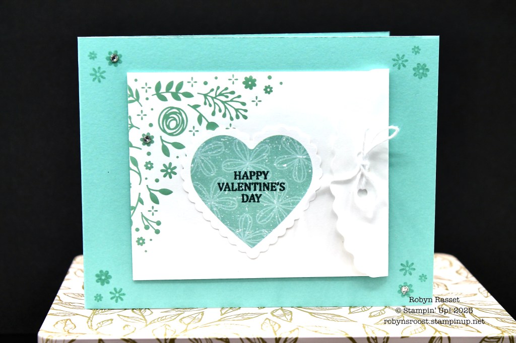 This next card was created with more items from the I’ll Bee Yours January 2020 Paper Pumpkin Kit. The pretty foiled pouch on the front is actually a treat bag which I’ve attached to an 11″ x 4 1/4″ card base which is scored at 5 1/2″. The heart is from the Retired Pleased As Punch Designer Series Paper and then punched with a Scalloped Heart Punch. White Linen Thread is tied in a bow through the holes in the flap. A glue dot holds the flap closed. It can easily be opened to insert some cash or a gift card. The little flowers on the corners are done with Coastal Cabana ink, while the greeting is done in Tuxedo Black. Some small rhinestones are added to some of the flowers for some more sparkle.