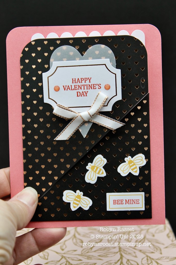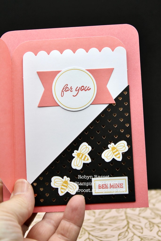 The velum heart, large greeting label, gems, and ribbon were all part of the original Heartfelt Love Notes Paper Pumpkin Kit. The greetings and little bees come from the I’ll Bee Yours January 2020 Paper Pumpkin Kit. Flirty Flamingo ink was used for the greetings.
