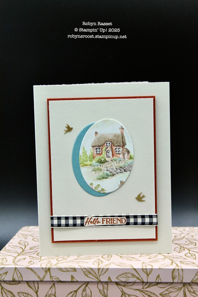 Most Wednesday’s I host a Mystery Card Game on my Creative Chicks Facebook Group. This simple card has a die cut from the Storybook Moments Designer Series Paper as the focal point. It was actually a scrap from the pretty oval frame die from the Storybook Friends Die set.