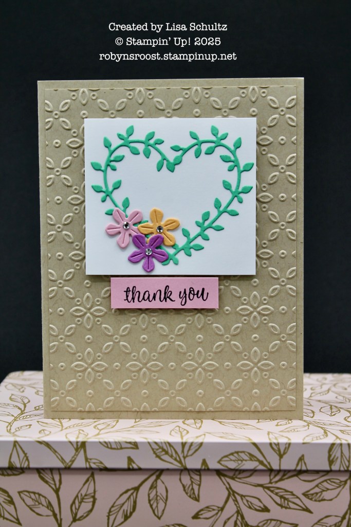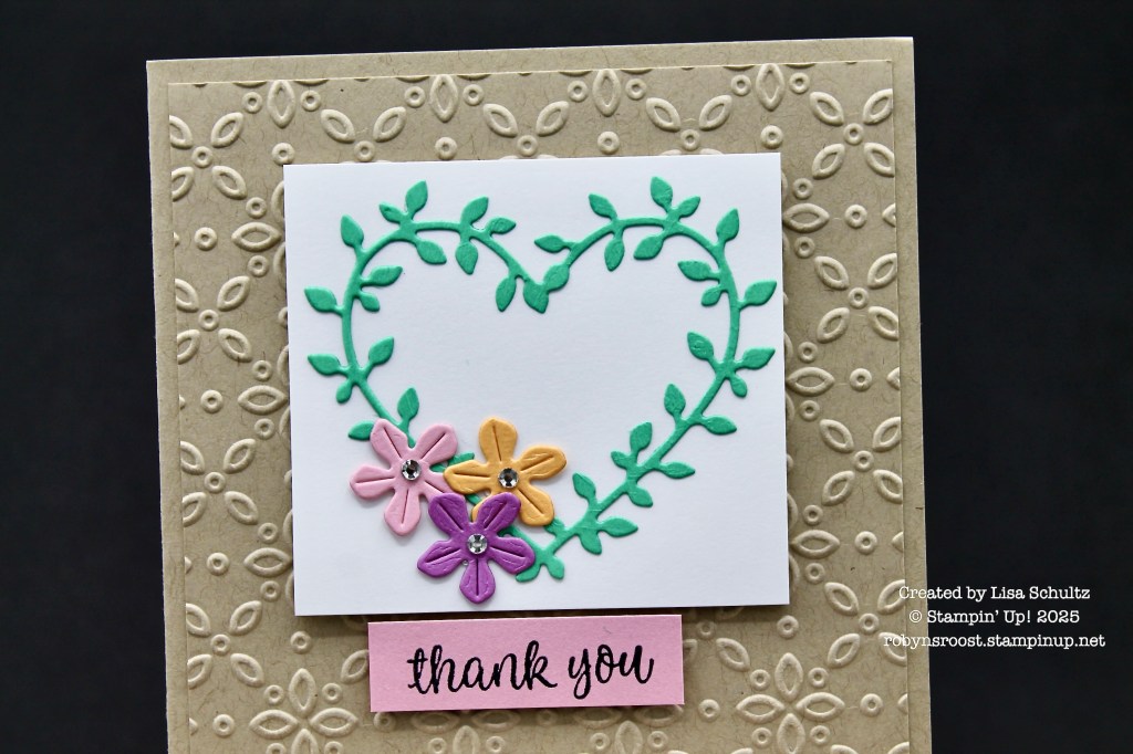Our first card was created by Lisa Schultz. I particularly love the way that Lisa has placed the three colorful flowers on the heart with rhinestone centers. The Eyelet embossed background coordinates well with the leafy heart die cut. The simple thank you greeting from the Heart Shaped stamp set is the perfect size and I love a font that is easy to read.