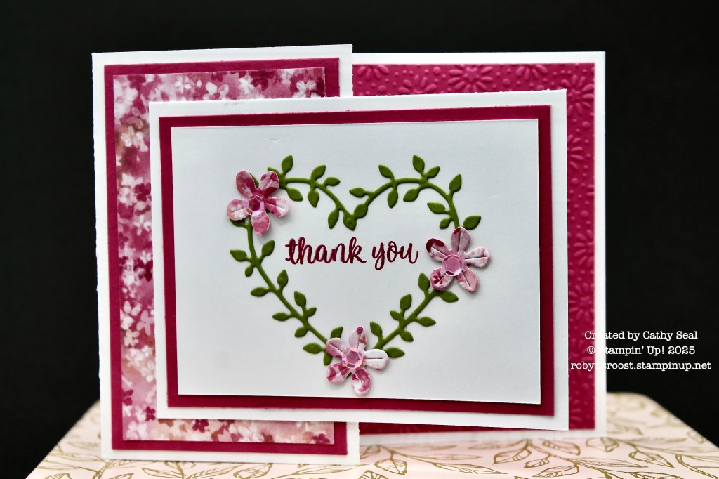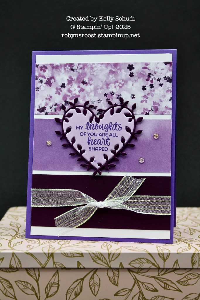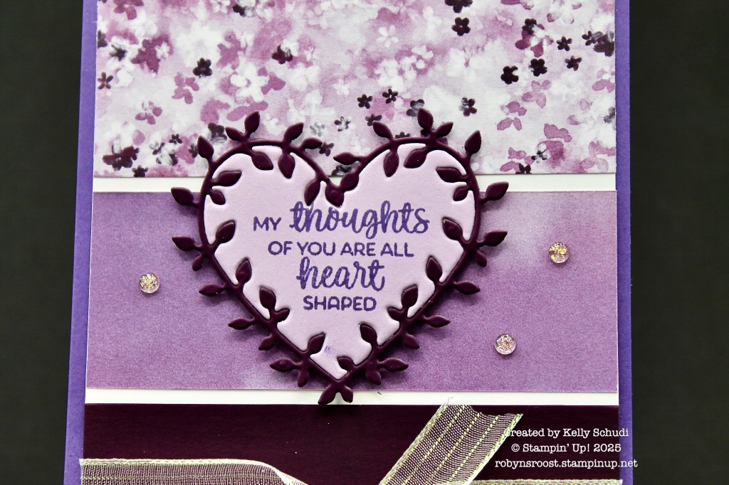 Cathy’s card uses a few other Sale-a-bration items as well as the Heart Shaped Bundle. The designer paper is from the Bloom Impressions pack, the pretty sequins are from the Purple Adhesive-Backed Sequins, while the embossing folder is the Starstruck Embossing Folder. So we can see four of the Sale-a-bration freebies all on one card.
