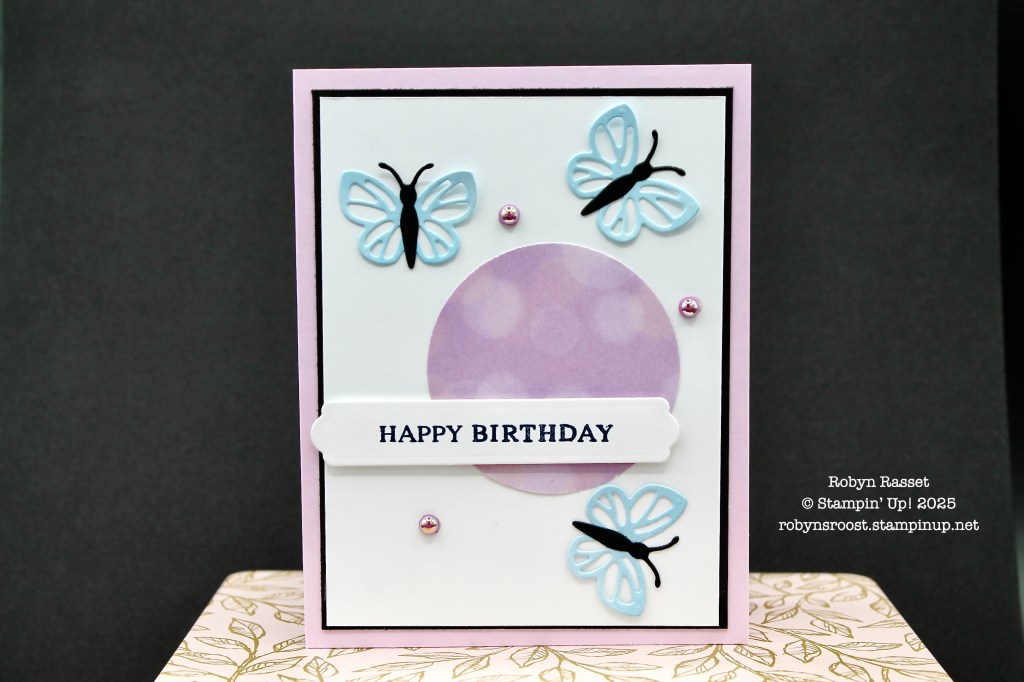 The first card uses the Beautiful Butterflies Bundle and Beautiful Bokeh Designer paper. The butterflies are die cut from a sheet of the Bokeh paper as is the circle.