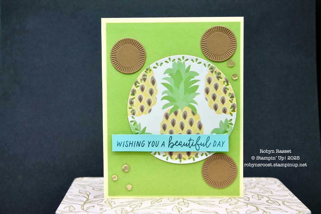 This card uses the Fruit Salad Designer paper (a free Sale-a-bration item) and the pretty Spotlight on Nature circle dies. The greeting is actually from the Beach Day stamp set for a total fun in the sun card.