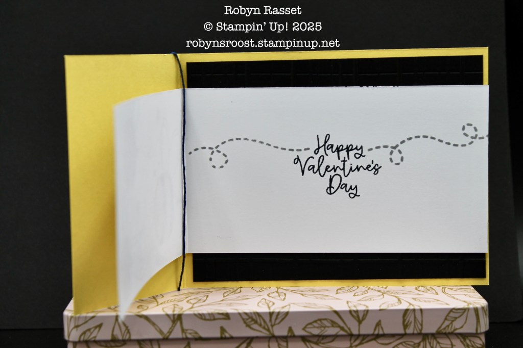 I’ve wrapped a piece of Baker’s Twine around both card bases. After the white base is adhered to the embossed layer, a scissors was used to trim off the edge of the white inner card base that was sticking over the edge.