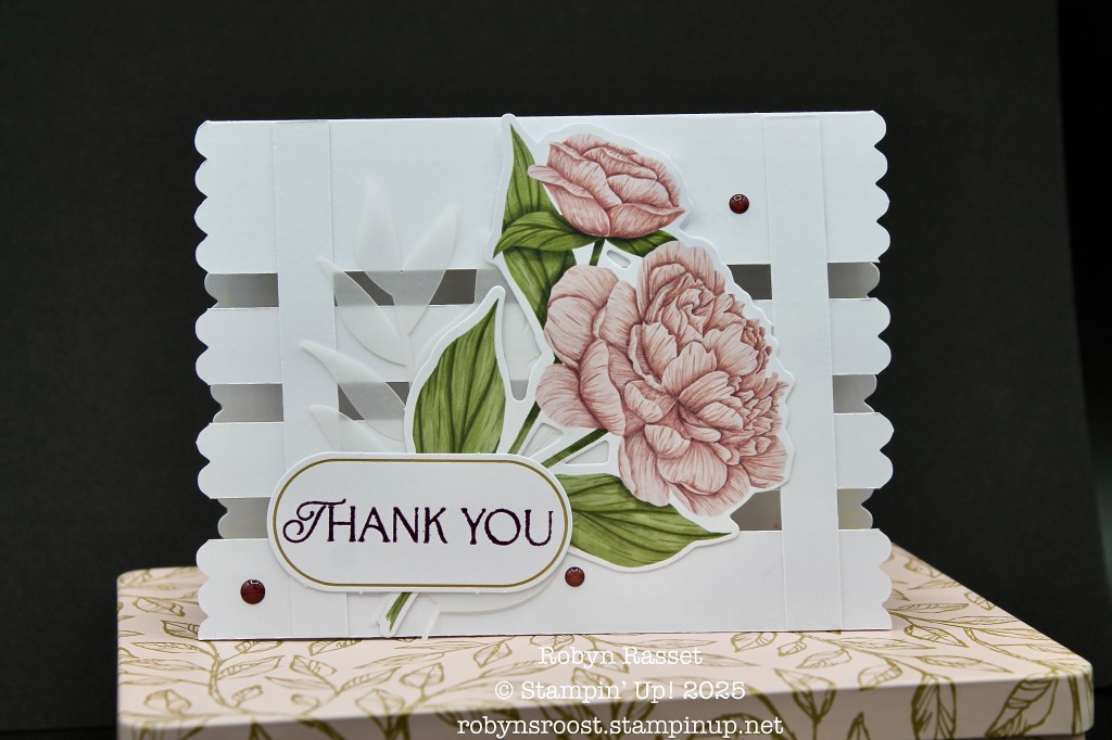 The second card is a pretty Trellis card CASED from the talented Rachael Tessman. Simply trim off the scallops from the bottom edge of the card base and then cut off strips to use for the upright boards. In total 5 strips are cut off from the front. I love Rachel’s measurements.
