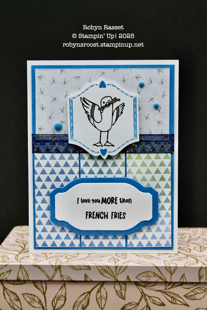 The seagull resides on paper punched from the To The Point Label Punch. This is a super versatile punch! It can be purchased as a bundle with the Hugs for Love stamp set, which was used to stamp the border here, PLUS it also coordinates with the Bright Borders stamp set.