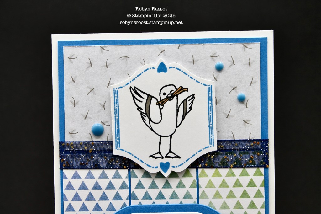 The patterned paper with little dragonflies comes from the Lily Pond Lane Designer Paper (what’s good for ducks must be good for seagulls too, right?). The geometric triangle pattern comes from the Bright & Beautiful DSP.