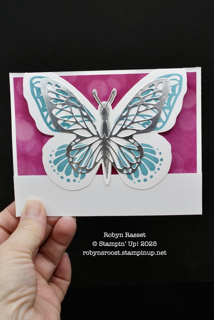 The silver butterfly die cut had a really tiny body so I die cut the separate body and added it under the butterfly. This card has both heads. I’ve colored the butterfly body under it with a black colored pencil. The bottom wings were stamped with two stamps that are included in the stamp set but to create the top wings one of the large images was partially inked and stamped.