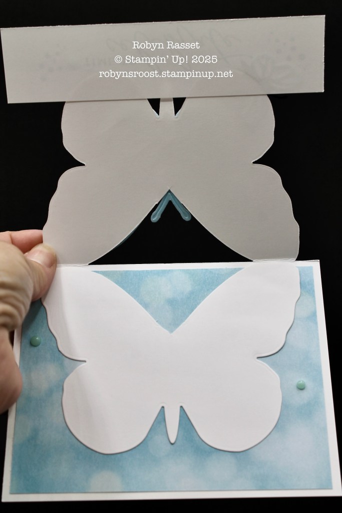 I’m not sure why, but there aren’t stamps to decorate the large butterfly and the head of the large butterfly doesn’t match up with the die cut butterfly used on this card. I watched a video by Cindy at CindyLeeBee Designs and she suggested cutting off the large butterfly’s head, and that definitely helped. By adding a strip on the bottom of the butterfly the card will stand.