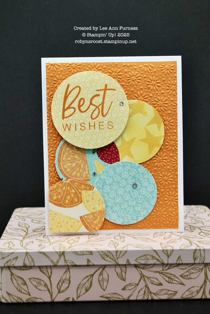 This next card was created by Lee Ann Furness and features more circles (I love this layout!) punched from the Fruit Salad Paper. The greeting from the With You In Mind stamp set is stamped directly on the DSP. The bottom circle runs off the card and is trimmed, giving the feeling that the circles continue on. The background layer is embossed with the Starstruck Embossing Folder, another item that is Free with a $60 order during Sale-a-bration.
