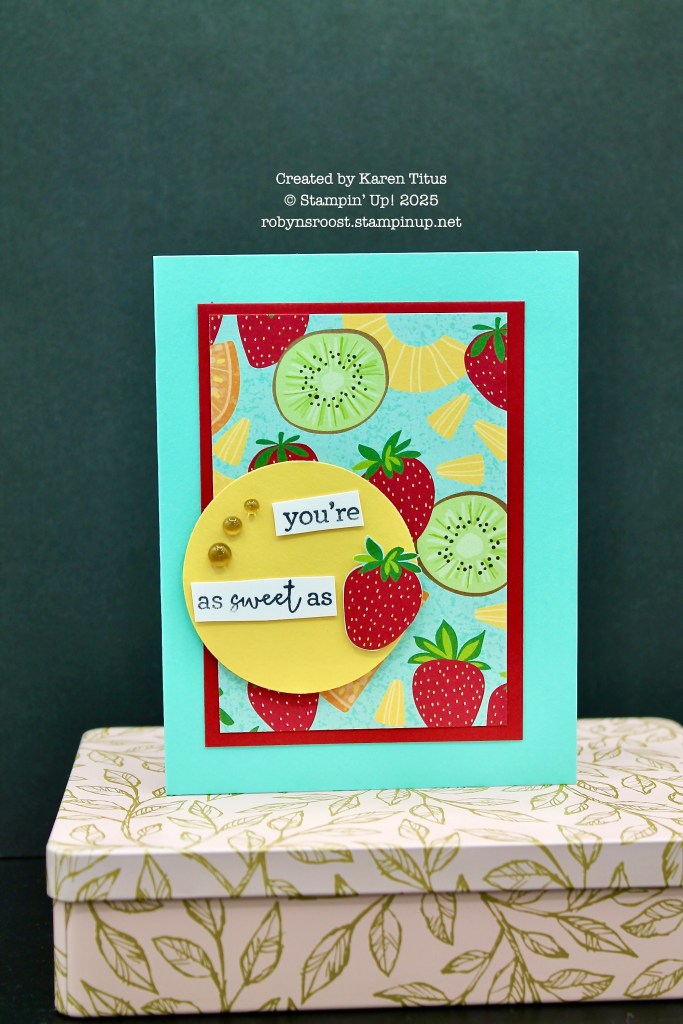 Anyway, I’ve got two cards today featuring the Fruit Salad Designer Paper from Sale-a-bration. The patterns are so fun!