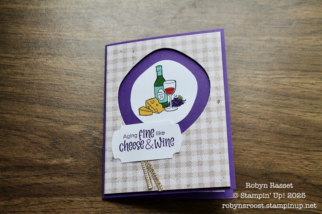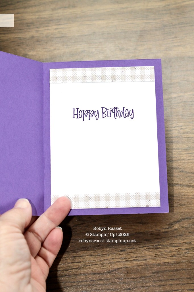 The image is colored with Stampin’ Write Markers from the regals and brights families. Did you know that you can get these two items free during Sale-a-bration when you purchase a Starter Kit? The checked pattern Perennial Lavender Designer Series Paper is popped up with dimensionals to give the card some dimension.