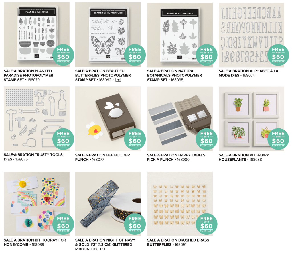 More items were added to the Sale-a-bration Rewards, like the Alphabet. Ala Mode Dies which are a $42 value or the Trusty Tools Dies which are a $37 value. I’ve been using my Bee Builder Punch a lot, and I love my Happy Houseplants which are keeping me company on the kitchen wall right now.