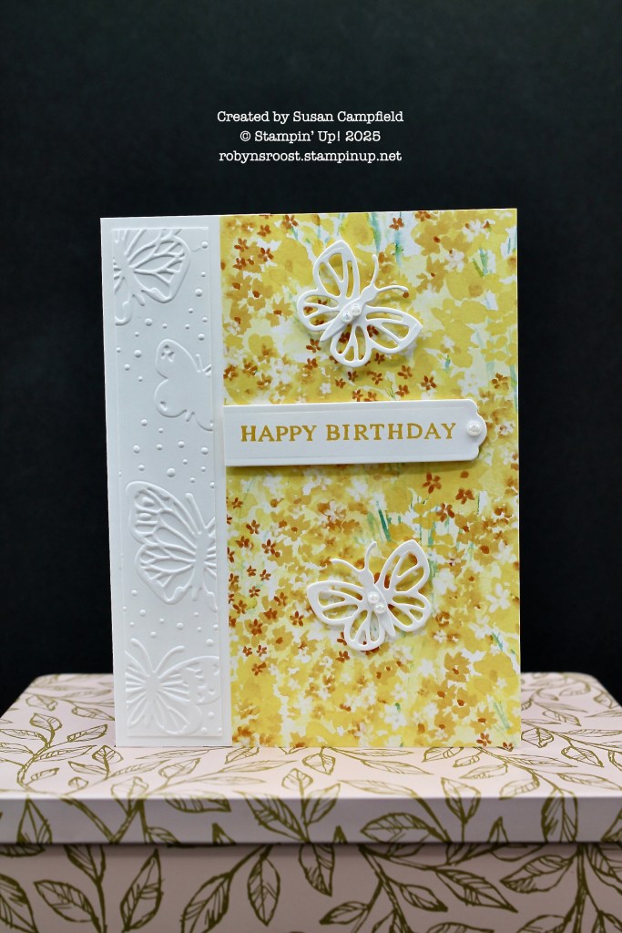 Susan’s card is a perfect way to showcase both sides of beautiful two sided paper like the Bloom Impressions. She has combined with the Beautiful Butterflies Bundle.